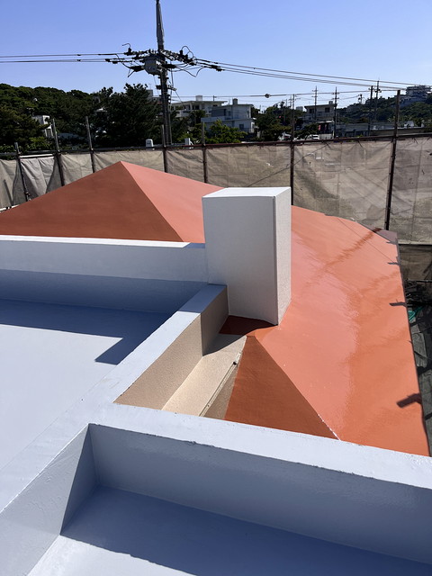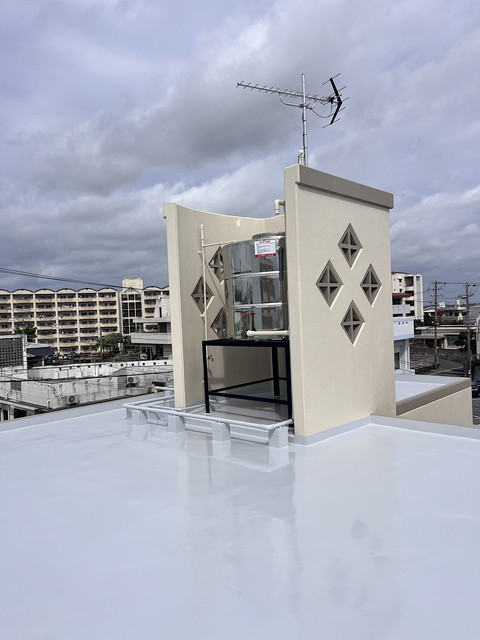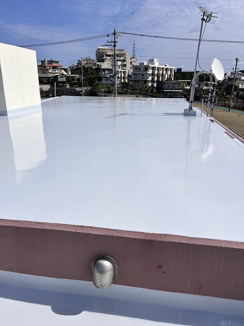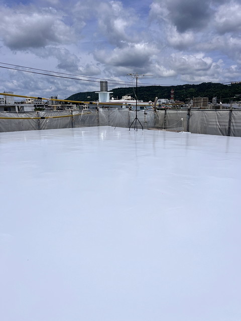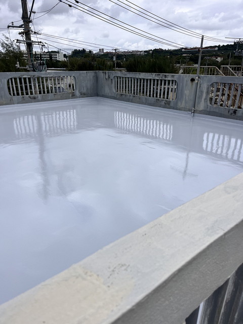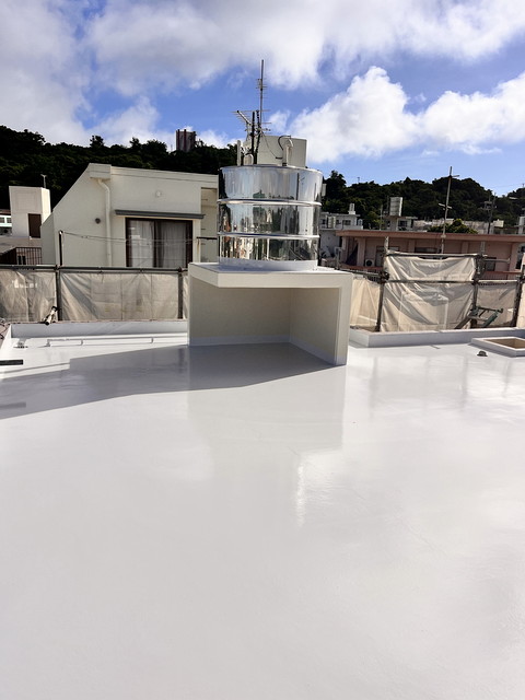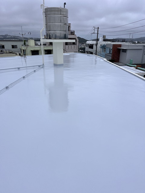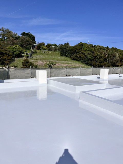 防水は下地にレジアンダー、防水層にプルーフロンバリュー2回塗り、仕上げにGR遮熱トップ2回塗りです。