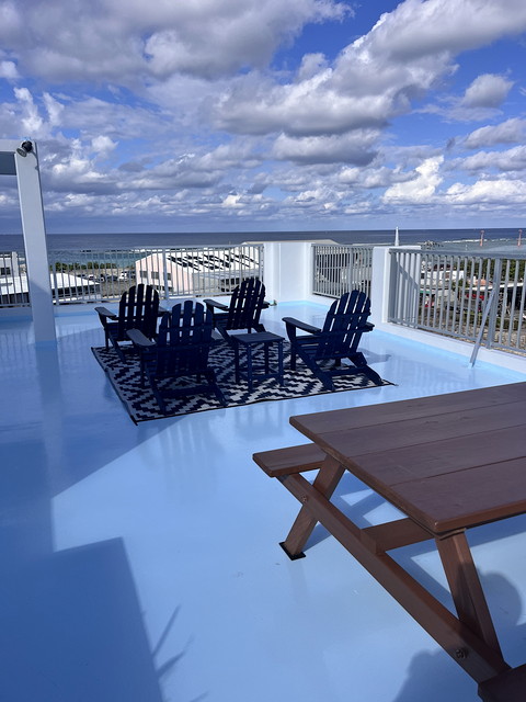 関西ペイントさんのダイナミックトップ仕上げ。通路・ベランダはロックペイントさんの簡易防水(滑り止め入り)